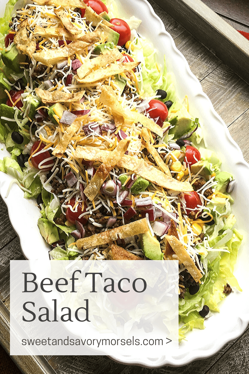 - To serve, transfer salad to platter and top with the seasoned beef black bean mixture, the Mexican Cheese, and tortilla strips.