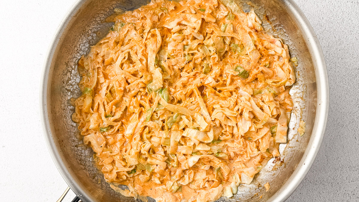 If you’re doubling the recipe, cook the cabbage in two batches or use a wider skillet so excess moisture can evaporate properly.