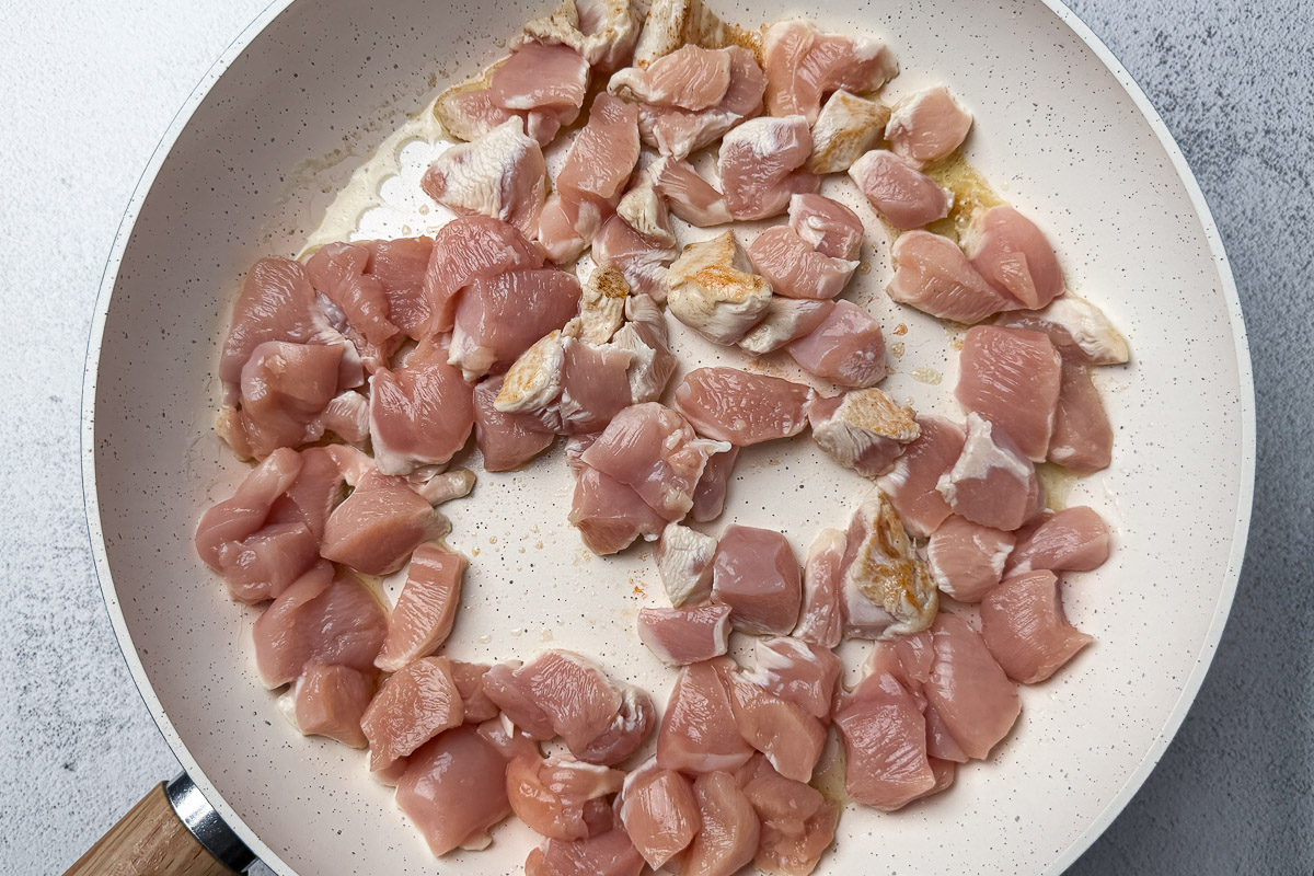 Chicken breast keeps this dish lighter while still being filling. Cutting it into small, even pieces helps it cook quickly and stay tender. If you’re worried about dry chicken, don’t be—because it finishes cooking in the sauce, so it stays juicy.