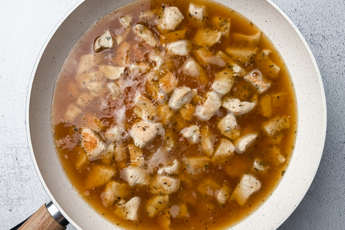 Pour in 3 cups of chicken broth and bring it to a gentle simmer, scraping up any browned bits from the bottom of the pan.