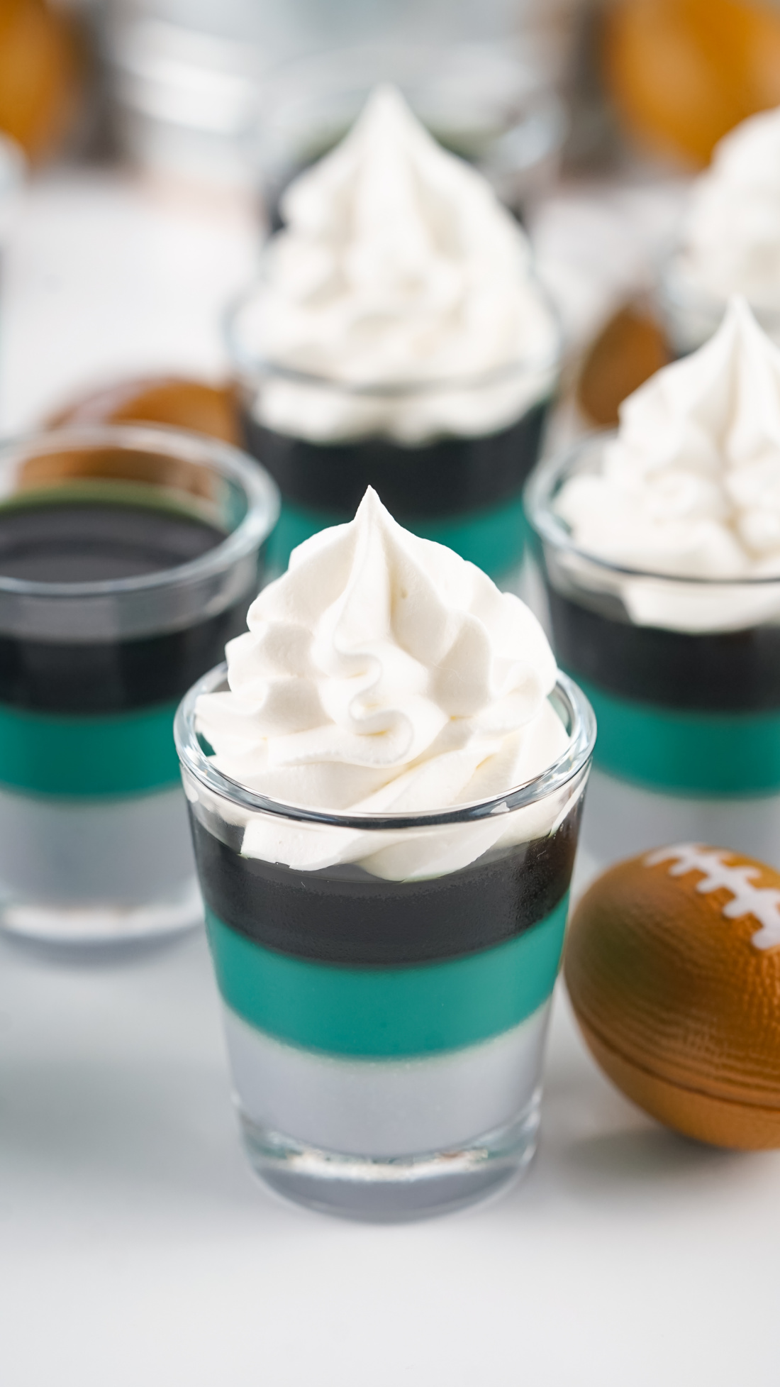Layered dessert shooters topped with whipped cream, featuring teal and black jelly layers in clear glasses, resemble Eagles Jello Shots, surrounded by decorative mini footballs on a white background.