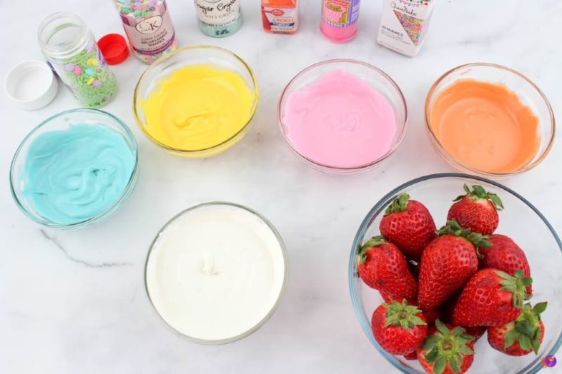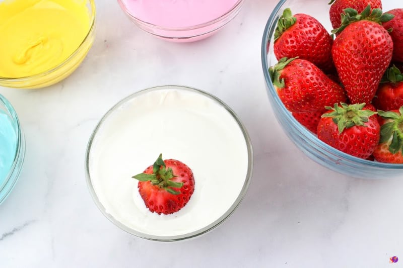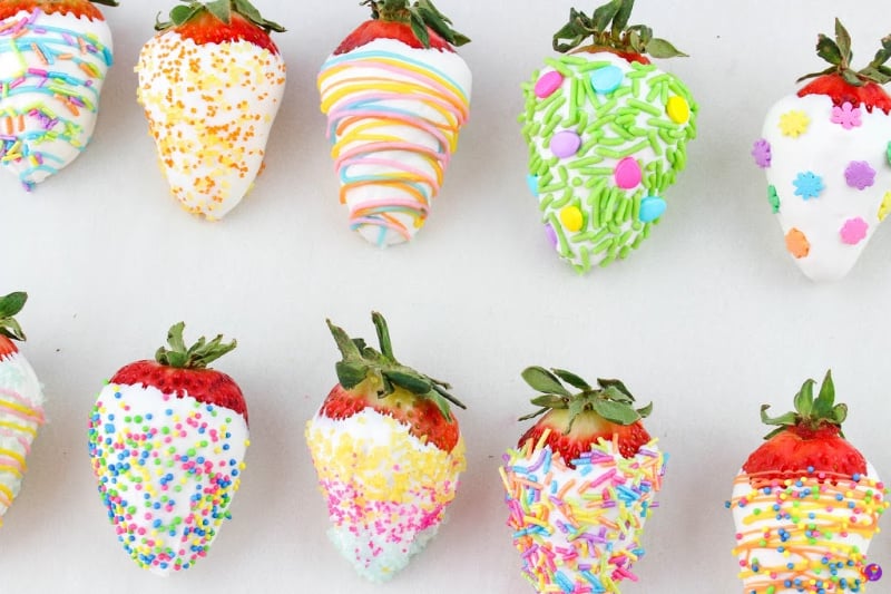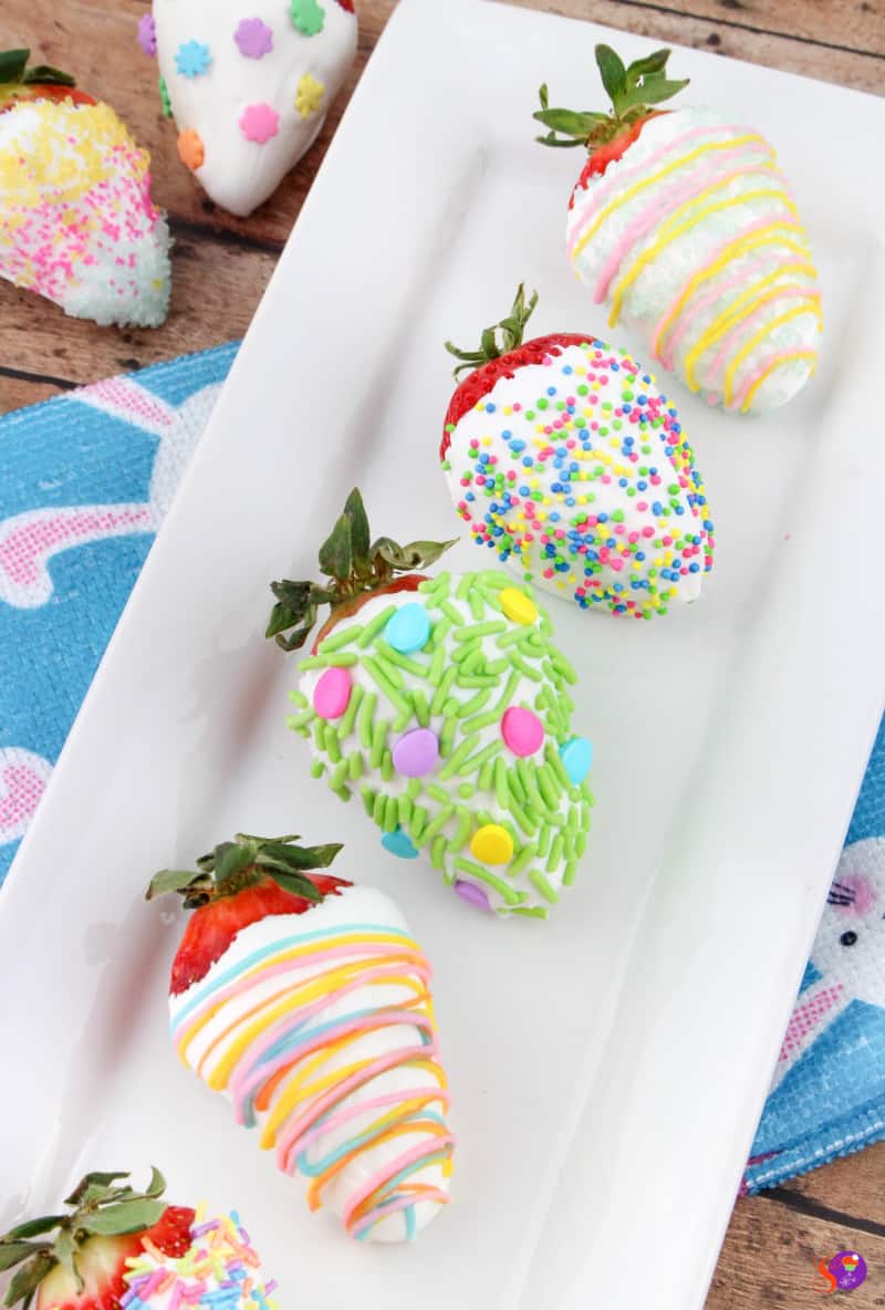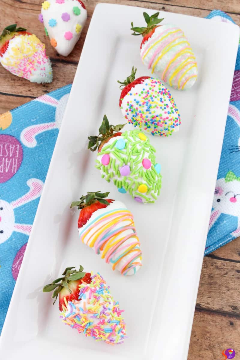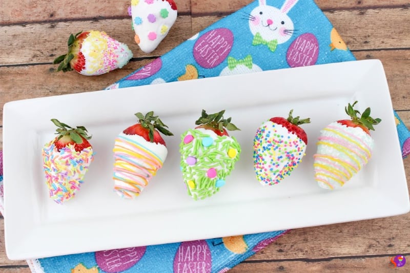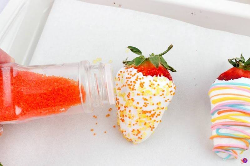 - Dip one strawberry into the white chocolate and place on a parchment-lined cookie sheet. Let dry completely before drizzling with other colors of chocolate. Dip another strawberry and immediately add Easter sprinkles. Any combination works, you can just have sprinkles, or just colored chocolate drizzle or both. Have fun creating different designs!