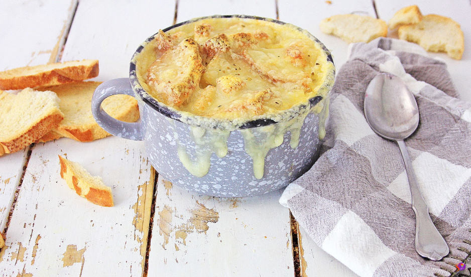 - When cheese is browned, remove the cookie sheet from the oven, and place the soup dishes on plates.