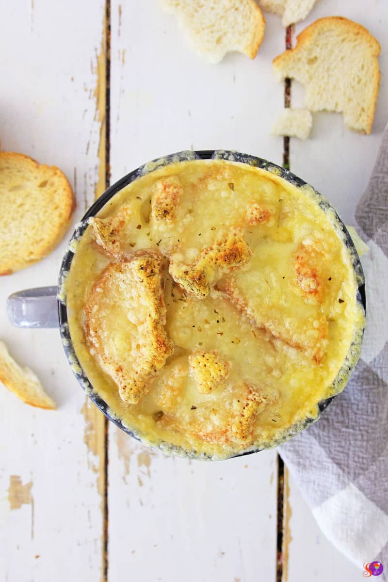 - When all soup dishes are filled and topped with bread and cheese, place the cookie sheet in the oven, under the broiler until the cheese is bubbly, and golden brown on top.