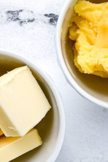 However, baking can be a bit different if you want to substitute. Since butter contains a small amount of water and milk solids, using it for baking provides the specific buttery flavor and texture many love. Since ghee is only fat, using it for baking may slightly change the end result.