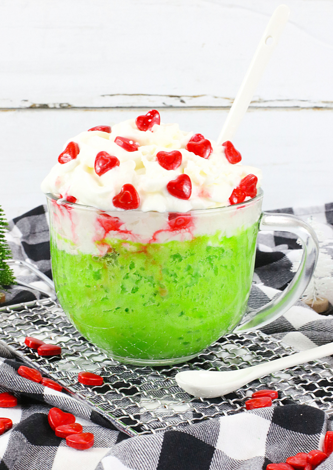 Clear mug with green dessert like a Grinch Mug Cake, topped with whipped cream and heart-shaped red candies on a black and white checkered cloth. A white spoon rests beside the mug, while a small tree decoration adds charm to this easy mug cake recipe scene.