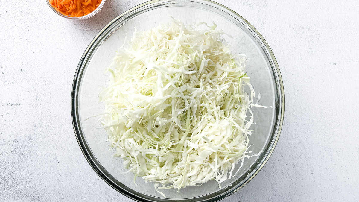- Prepare and Shred: Peel away one or two clean, sturdy outer leaves from the cabbage and set them aside. Finely shred the remaining cabbage into thin ribbons using a knife or mandoline. Grate your carrots and place everything into a large, non-reactive bowl.