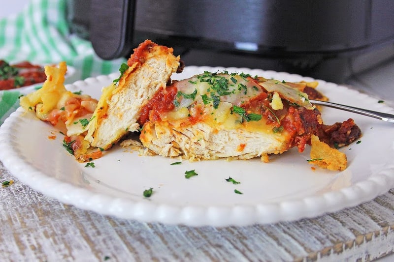 This yummy air fryer chicken parmesan is ready in about half an hour and the homemade sauce is flavor-packed.