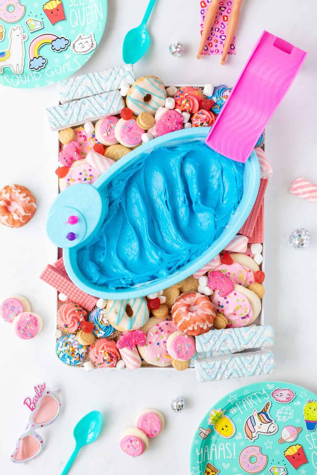 Serve the Barbie Pool Frosting Board with spoons and plates for all to enjoy.
